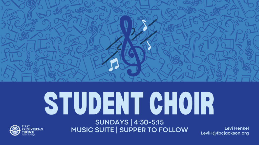 Students in grades six-twelve are invited to join us for Student Choir! We rehearse Sunday afternoons 4:30-5:15 with supper to follow. Students will develop and practice basic musical skills, lead worship in one Sunday night service a month, and enjoy meaningful fellowship with other student choir members, mentors, and staff. For questions, email Levi Henkel at LeviH@fpcjackson.org.