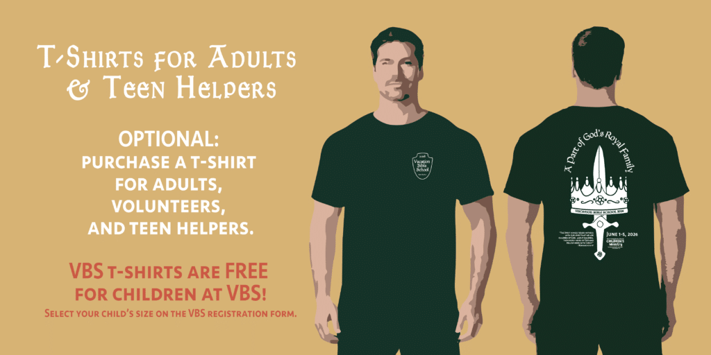Our VBS T Shirts are FREE for children participants. For teen helpers, volunteers, parents, or other adults, you are welcome to purchase a t-shirt. This is completely optional for those who would like a t-shirt.