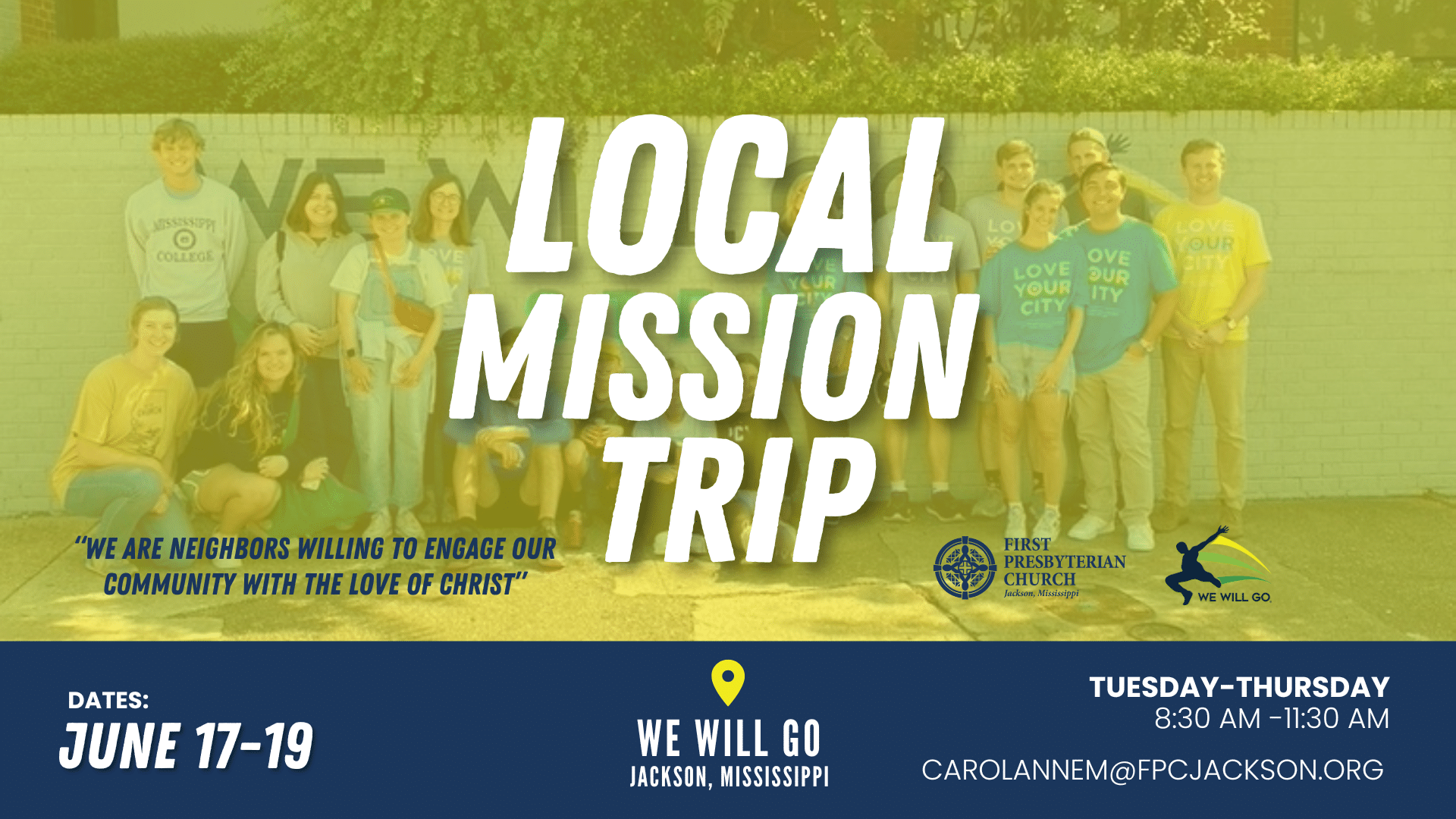 FPC is building a local missions team to serve at We Will Go this summer from 8:30 am -11:30 am on Tuesday June 17 through Thursday June 19. People of all ages, including families with children, are welcome, and projects include helping their campers (close to 100 children spend each weekday with them in the Read more...
