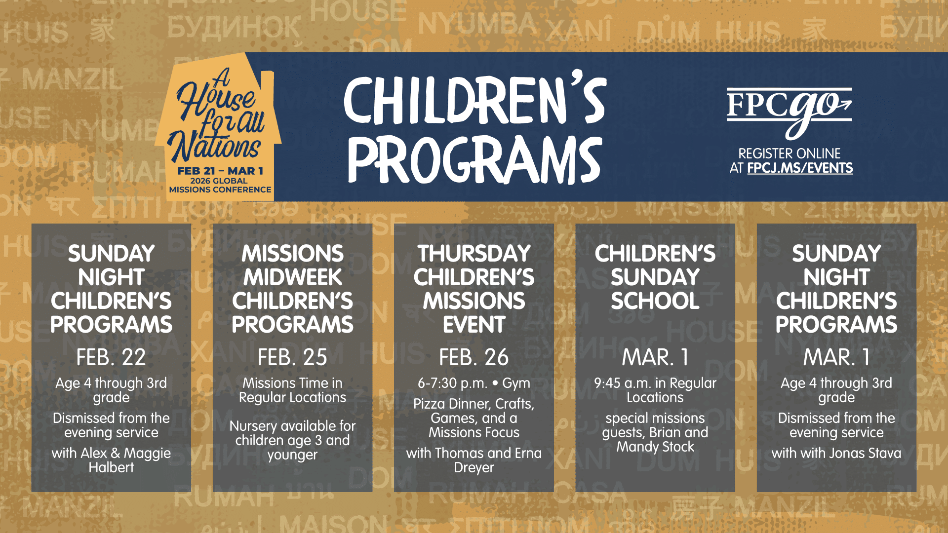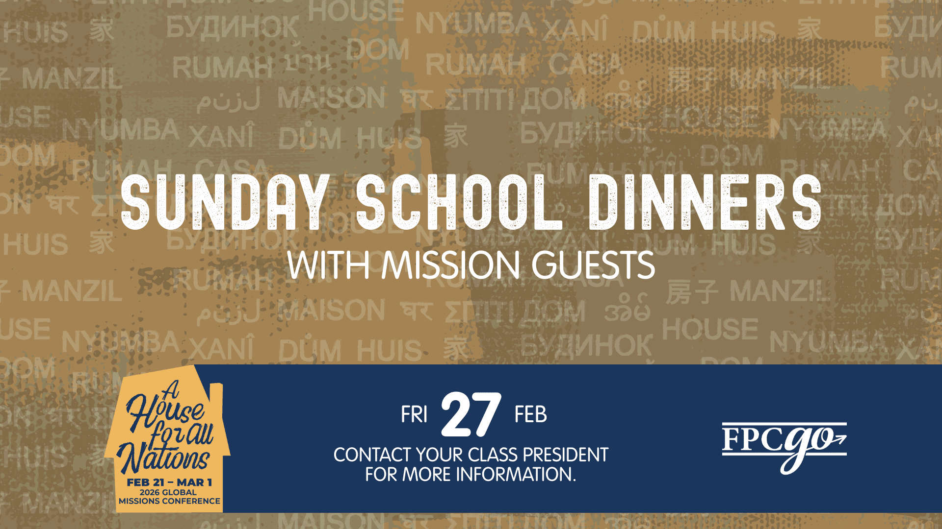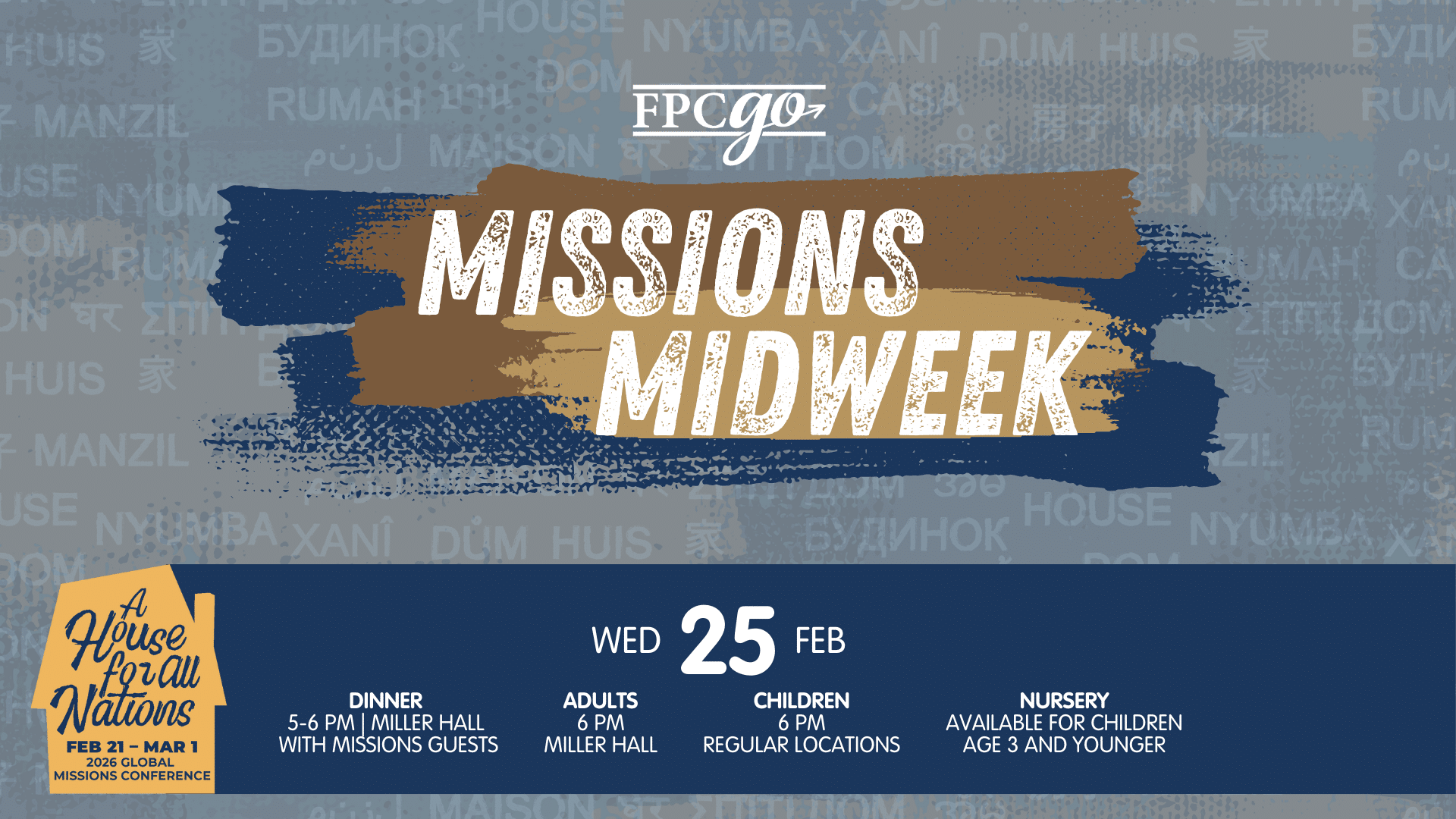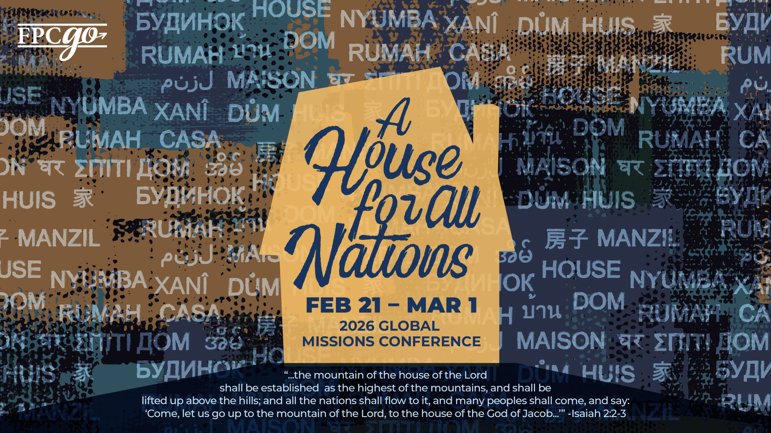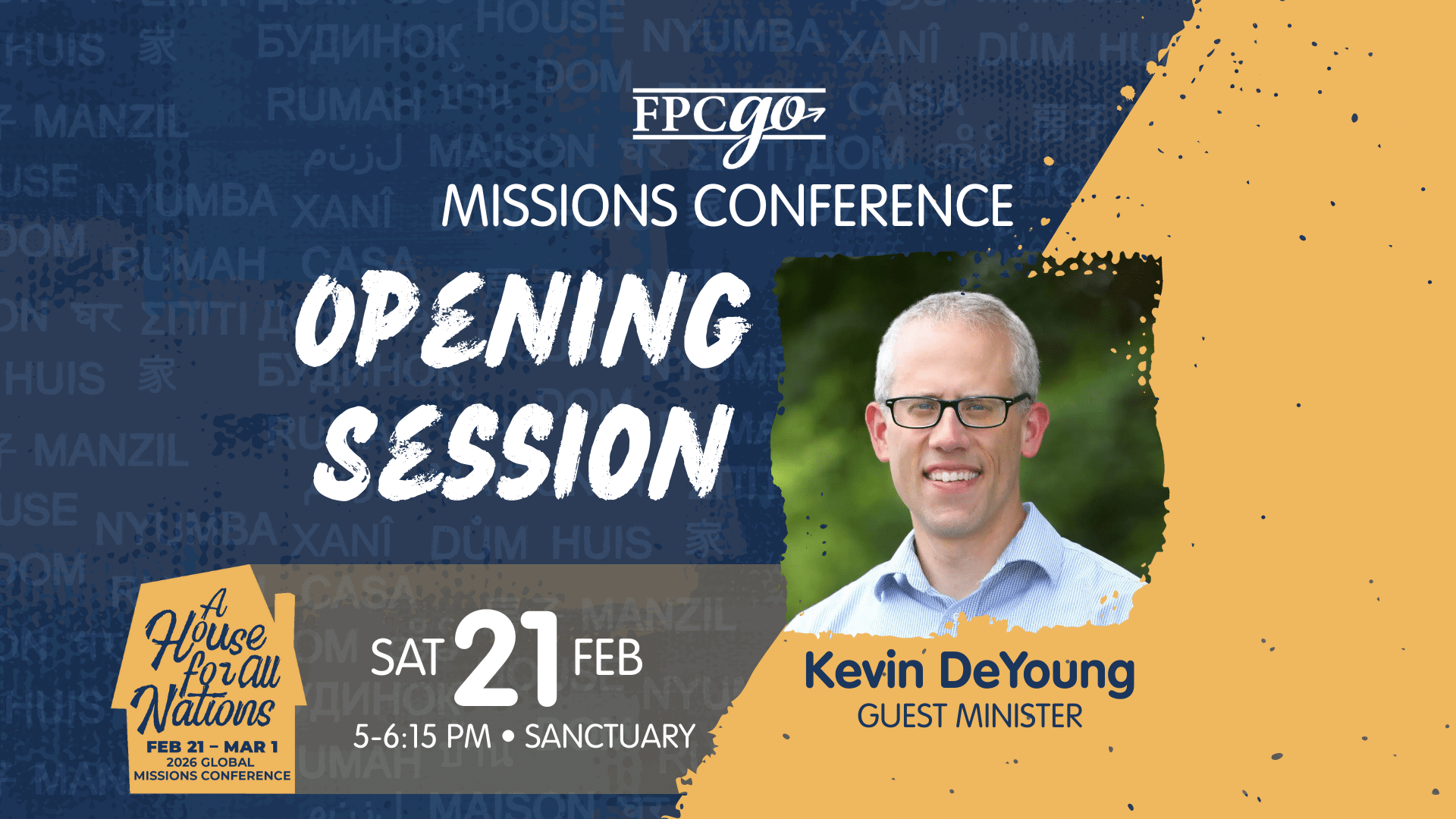 Global Missions Conference 2026 Make plans to join us for the 2026 Global Missions Conference: A House for All Nations, February 21-March 1! This week-long celebration will highlight God’s work among the nations through worship, teaching, and stories from missionaries serving around the world. We’re excited to welcome Kevin DeYoung, Jonathan (MTW), and many more Read more...