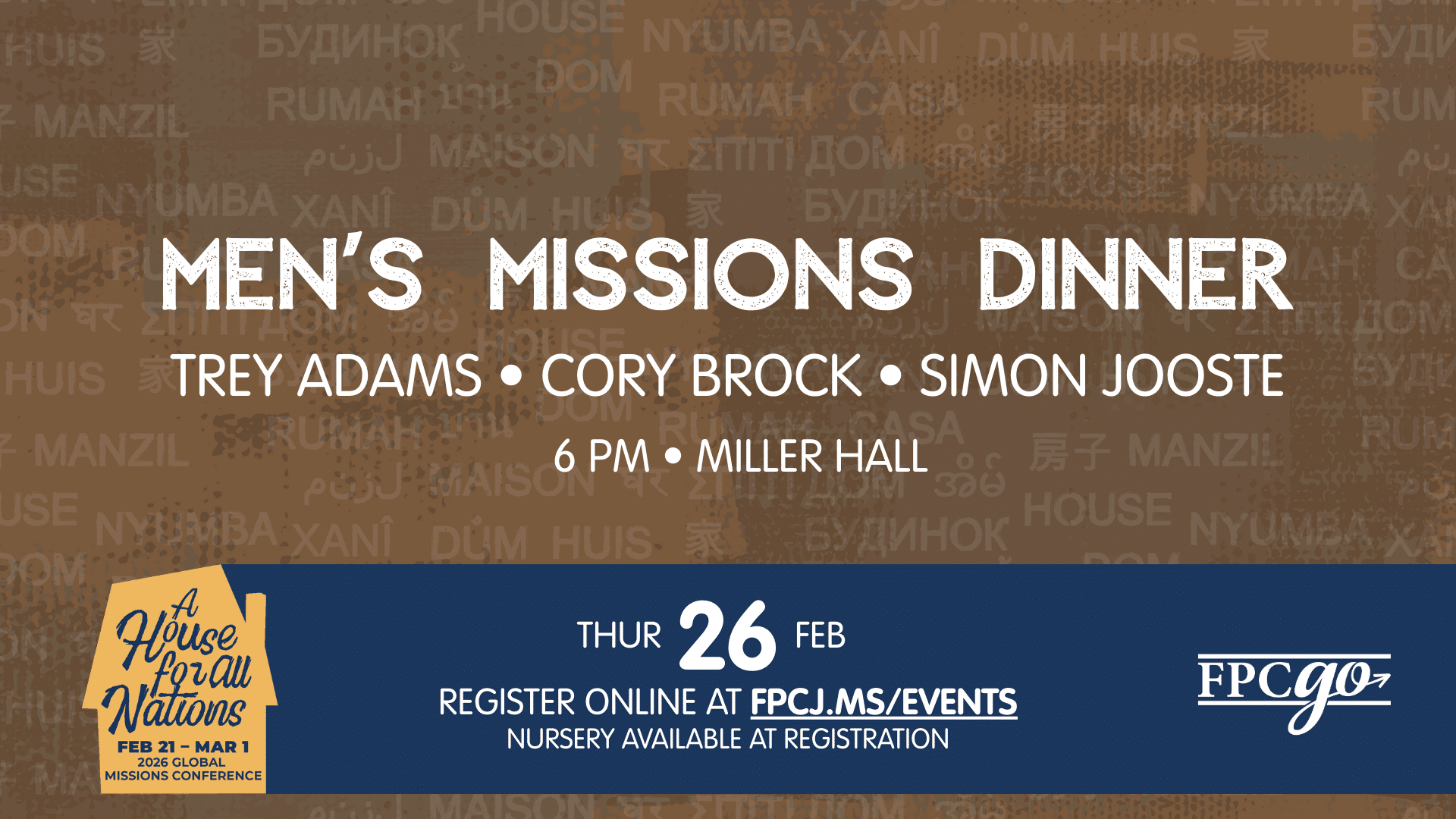 Men's Missions Event 6 p.m. Dinner in Miller Hall with Trey Adams, Cory Brock, and Simon Jooste