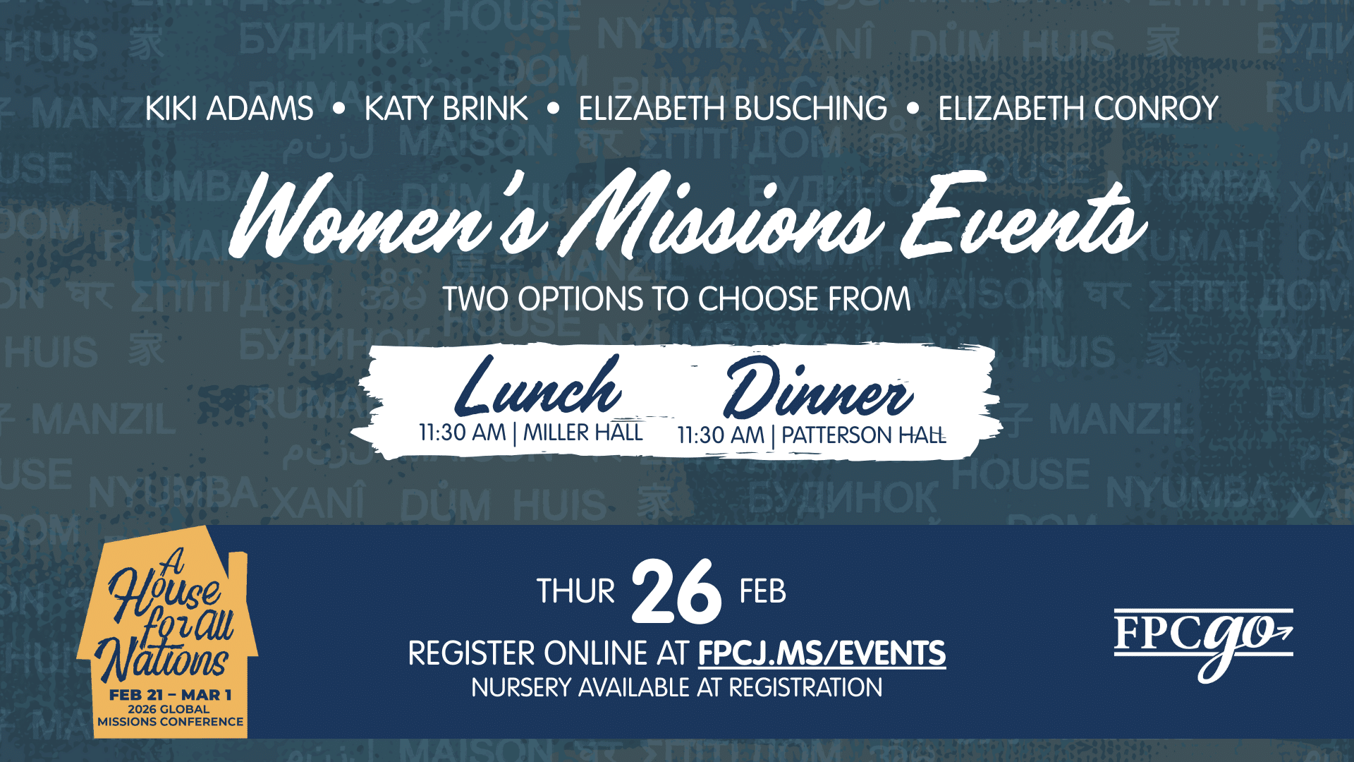 Women’s Missions Events two options to choose from: 11:30 a.m. Lunch in Miller Hall 6 p.m. Dinner in Patterson Hall with Kiki Adams, Katy Brink, Elizabeth Busching, and Elizabeth Conroy Read more...