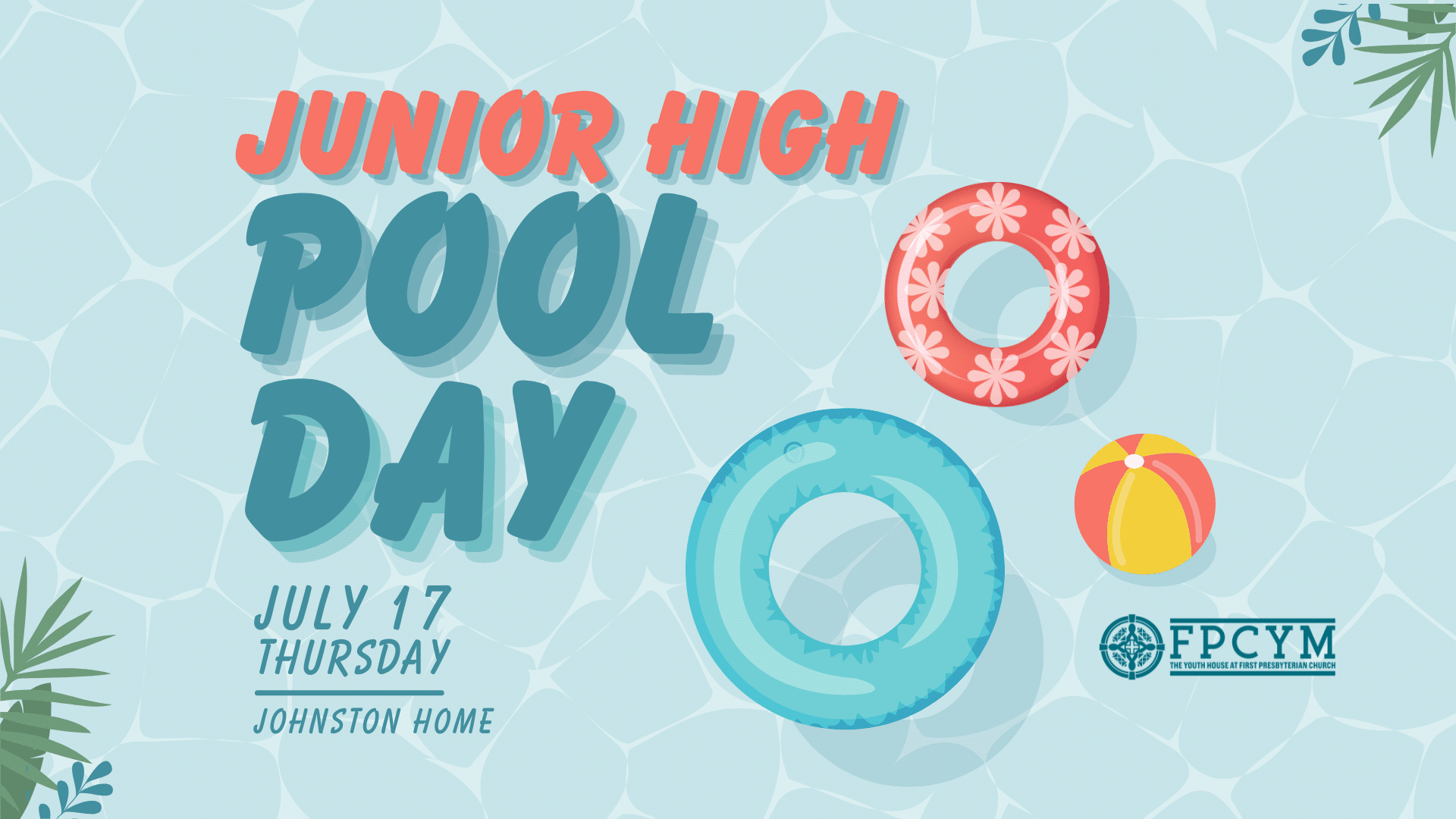 Make a splash with FPCYM! Junior High students (grades 7-9) are invited for a pool day July 17, 3:30-5:30 p.m. Save the date and make plans to be with us!