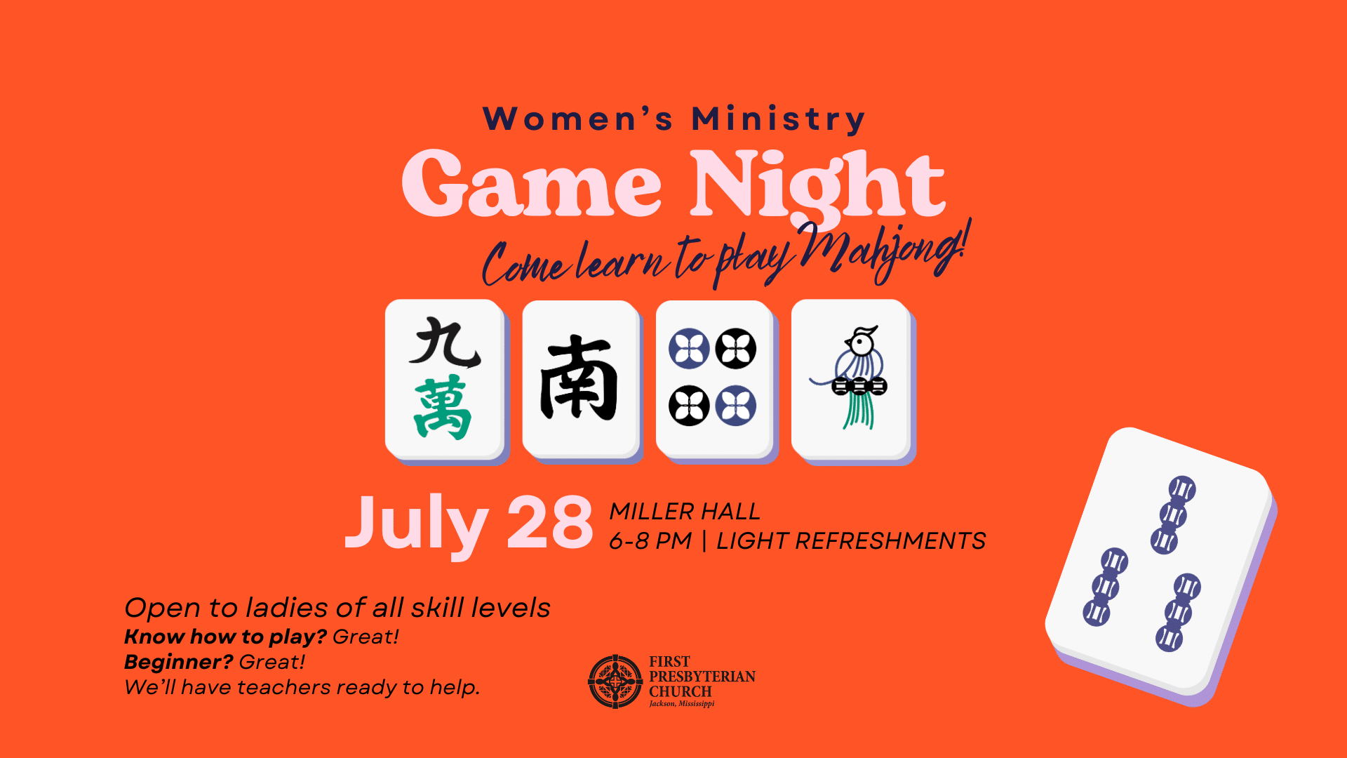 The Women’s Ministry is going to one last summer fun event. We will be hosting one more Mahjong on Monday, July 28 in Miller Hall from 6-8. It will be casual and open to all ladies whether you have played before or not. Light refreshments and teachers available to help. **You will need to Read more...