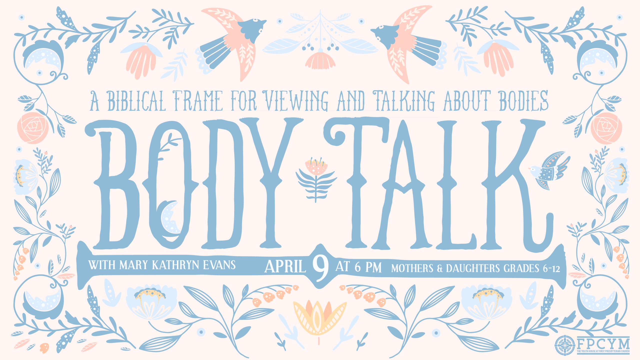 Body Talk with Mary Kathryn Evans A Biblical Frame for Viewing & Talking about Bodies Wednesday April 9, 6 p.m. in Westminster Hall 204 Mothers & Daughters (6th-12th Grade) In Read more...