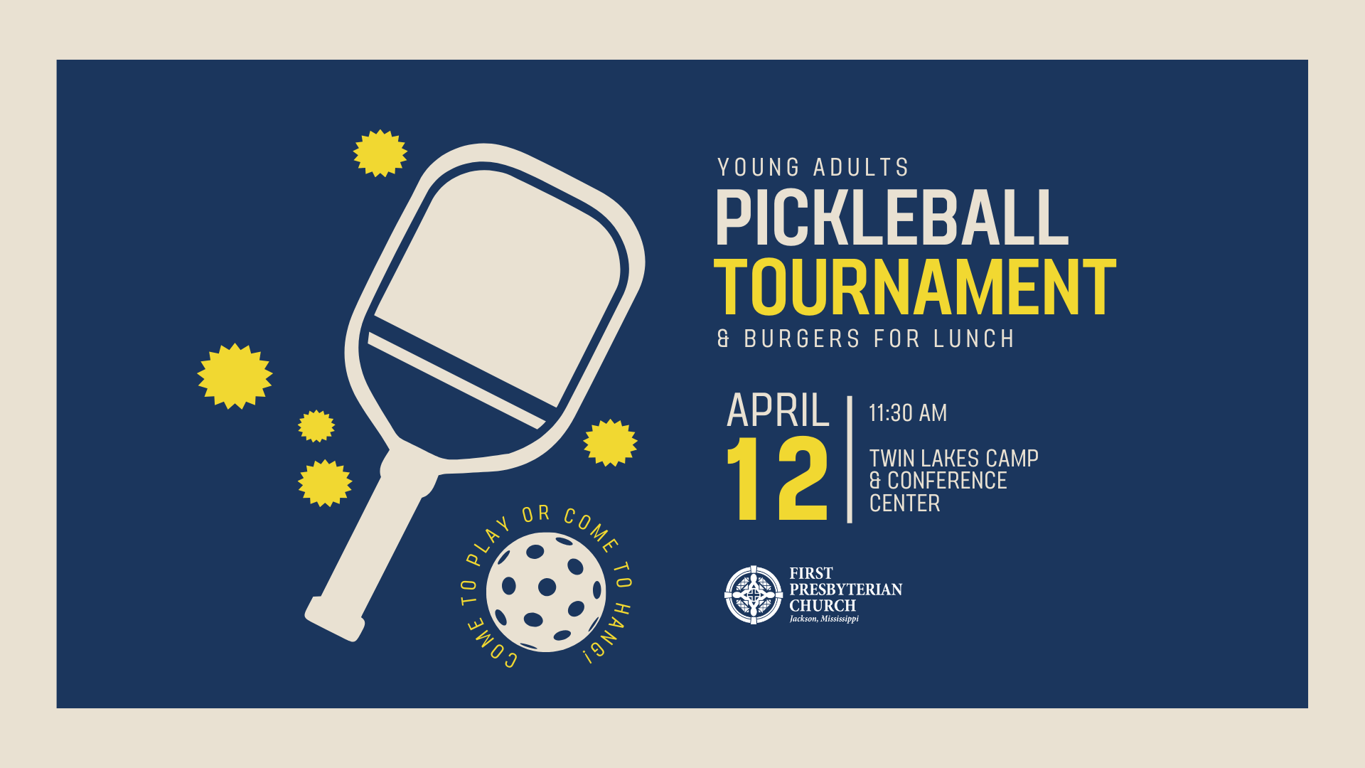 April 12 11:30AM Twin Lakes pickleball courts Burgers on the grill for lunch. Come to play or come to hang!
