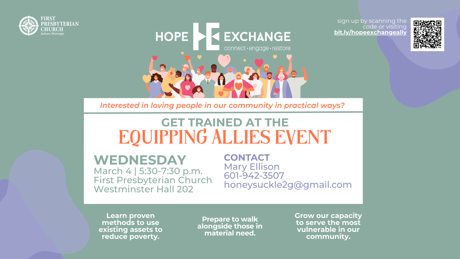Hope Exchange will be holding an Equipping Allies event at FPC for anyone who wants to be better prepared to walk alongside those in material need in a fruitful way. Read more...