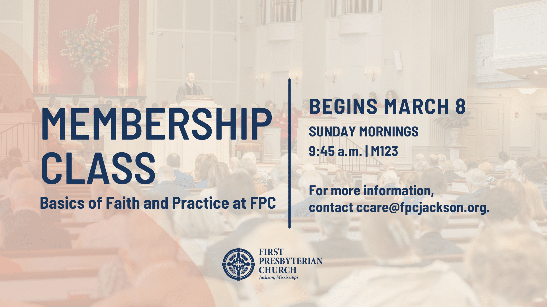 Membership Class — Beginning March 8 Interested in becoming a member of First Presbyterian? Our upcoming Membership Class will begin March 8 and will meet on Sundays at 9:45 a.m. in M123. Contact Emily Eastman at emilye@fpcjackson.org to register or to ask for more information. This is the place to begin if you are considering Read more...